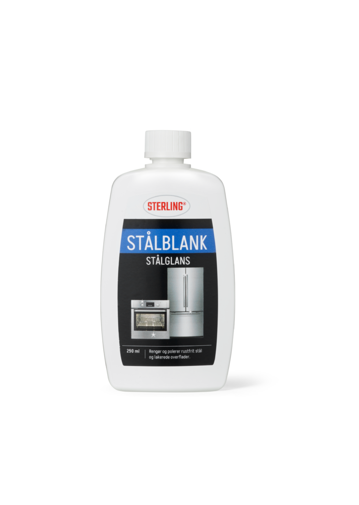 Sterling Stålblank er velegnet til hvidevarer fremstillet af rustfrit, blankt og børstet stål samt aluminium. Produktet rengører og blanker i én arbejdsgang, og fjerner nemt fedtfingre.